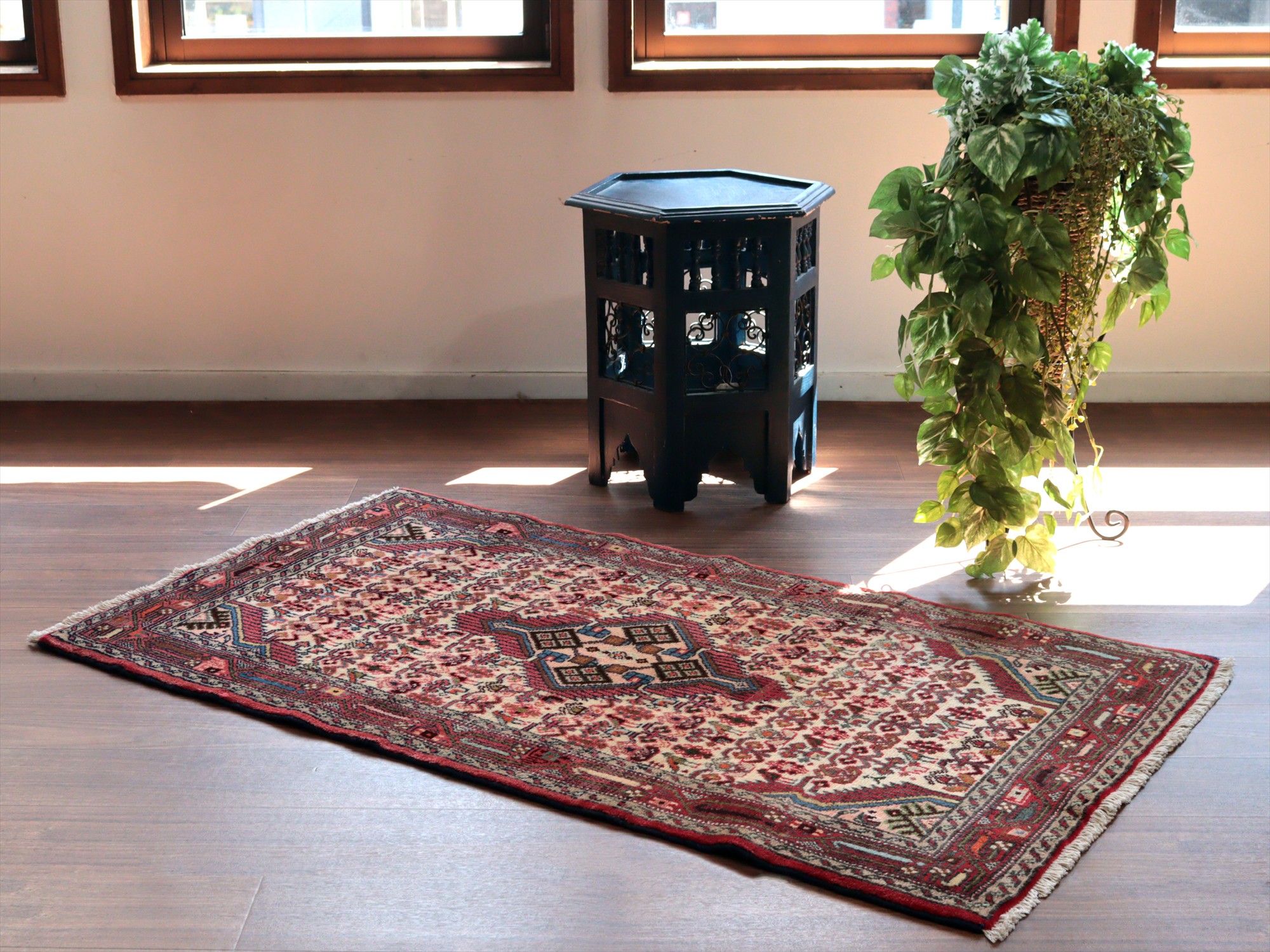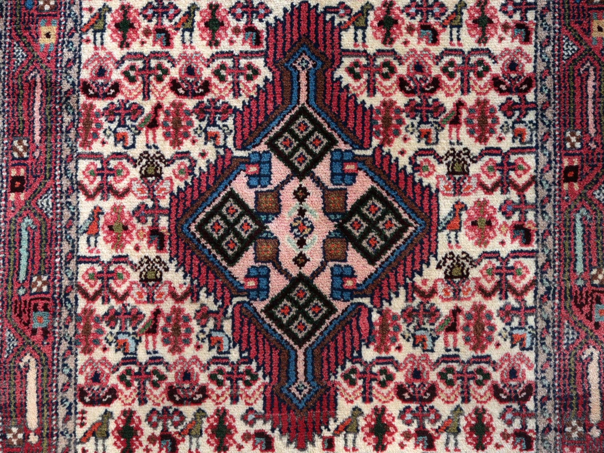 イラン西部、ハマダンの北に位置するナハバンドの絨毯です。ベージュと朱色に近いレッドをメインとした色使いで構成されています。中央には特徴的なメダリオン、そのまわりには鳥や小花が全面を飾るように織られています。