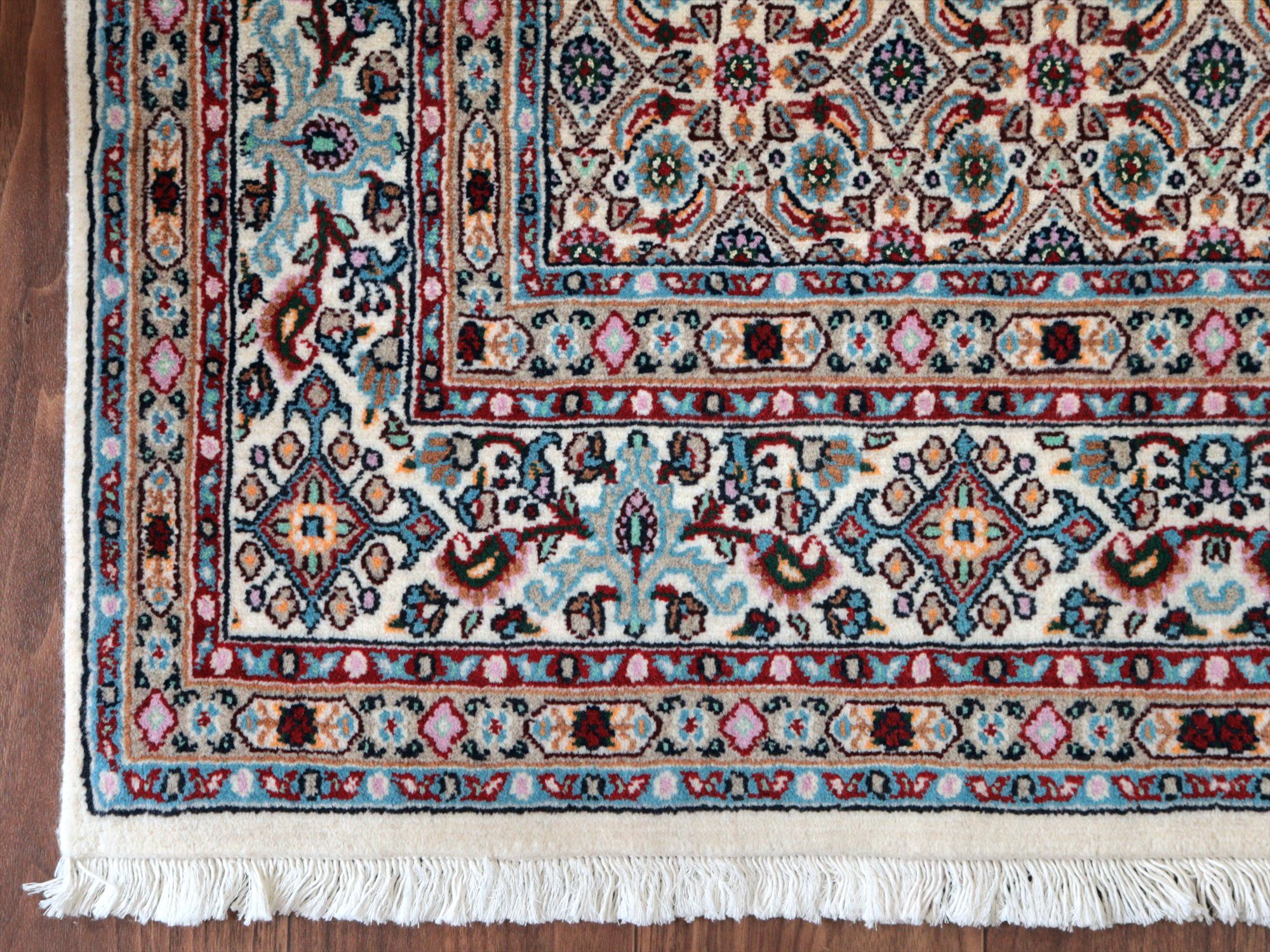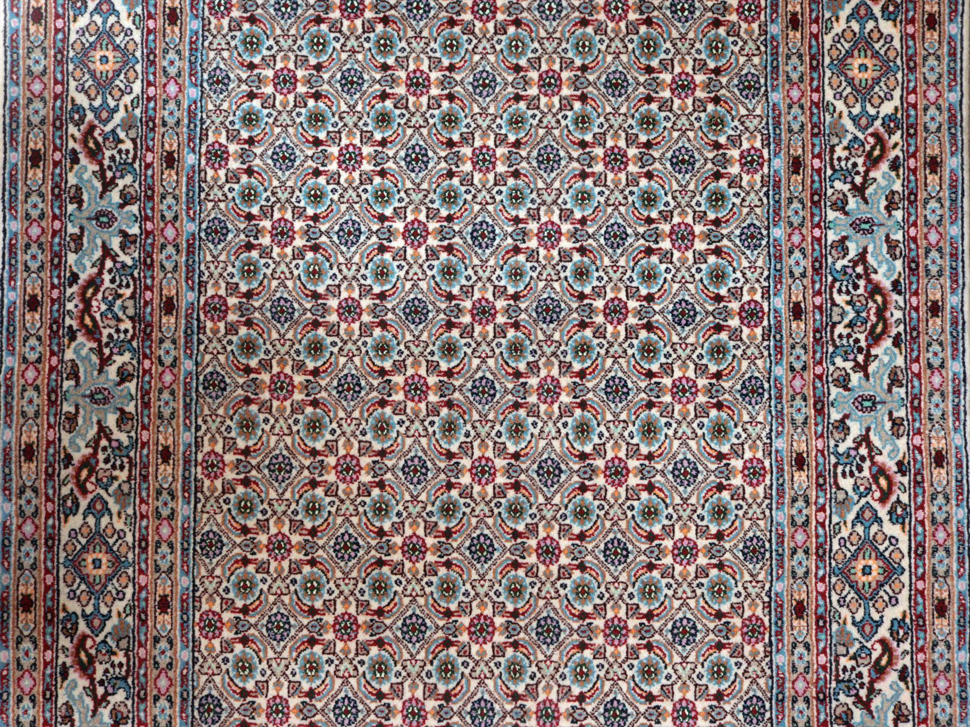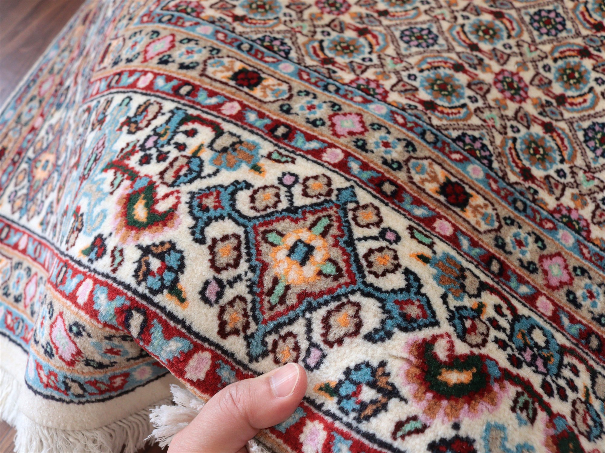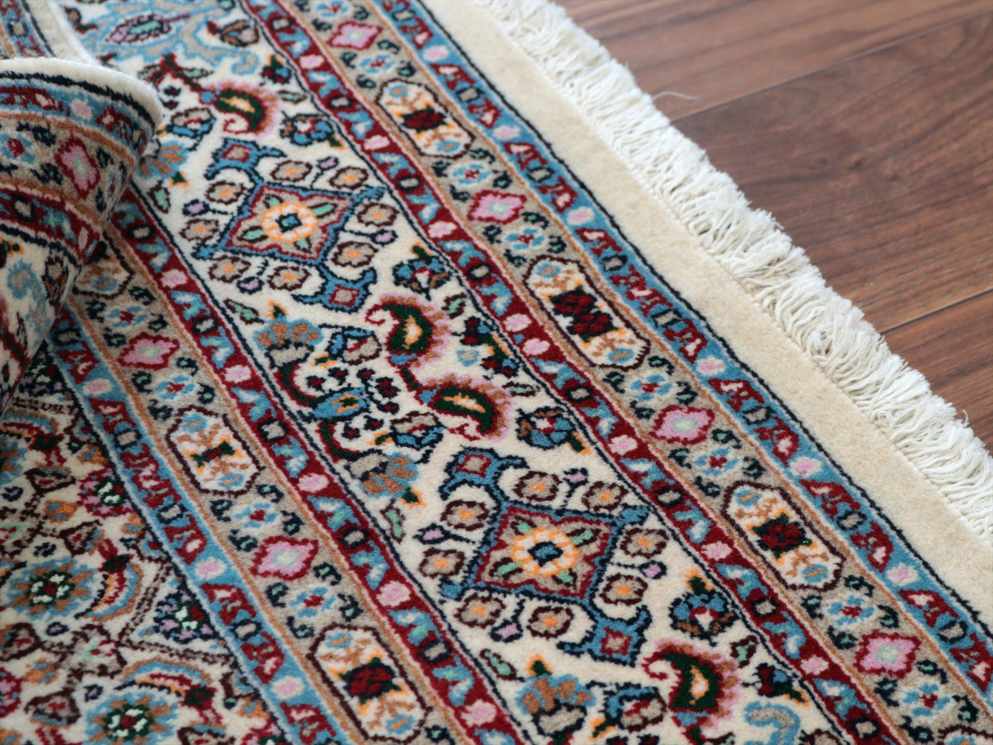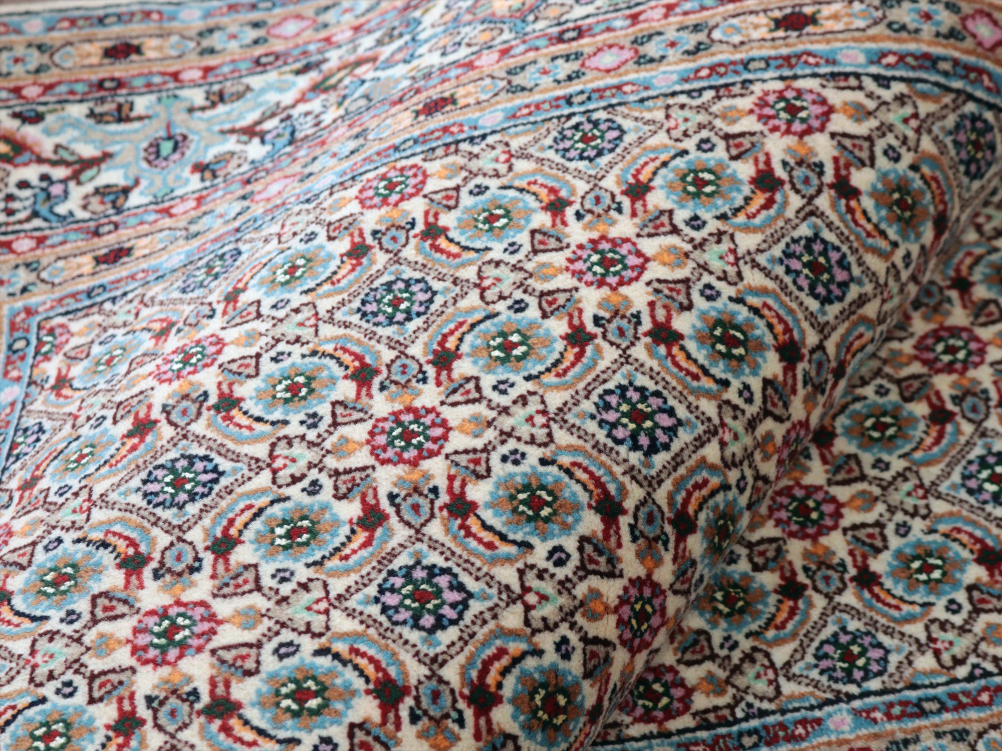 アイボリーをベースに、主にグリーンの色糸を使い細かな小花文様が織り込まれたムード産の手織り絨毯。イラン東部からアフガニスタンにも一般に見られるヘラート文様で、小さな花びらの形はマヒ(魚)と表現されることもあります。