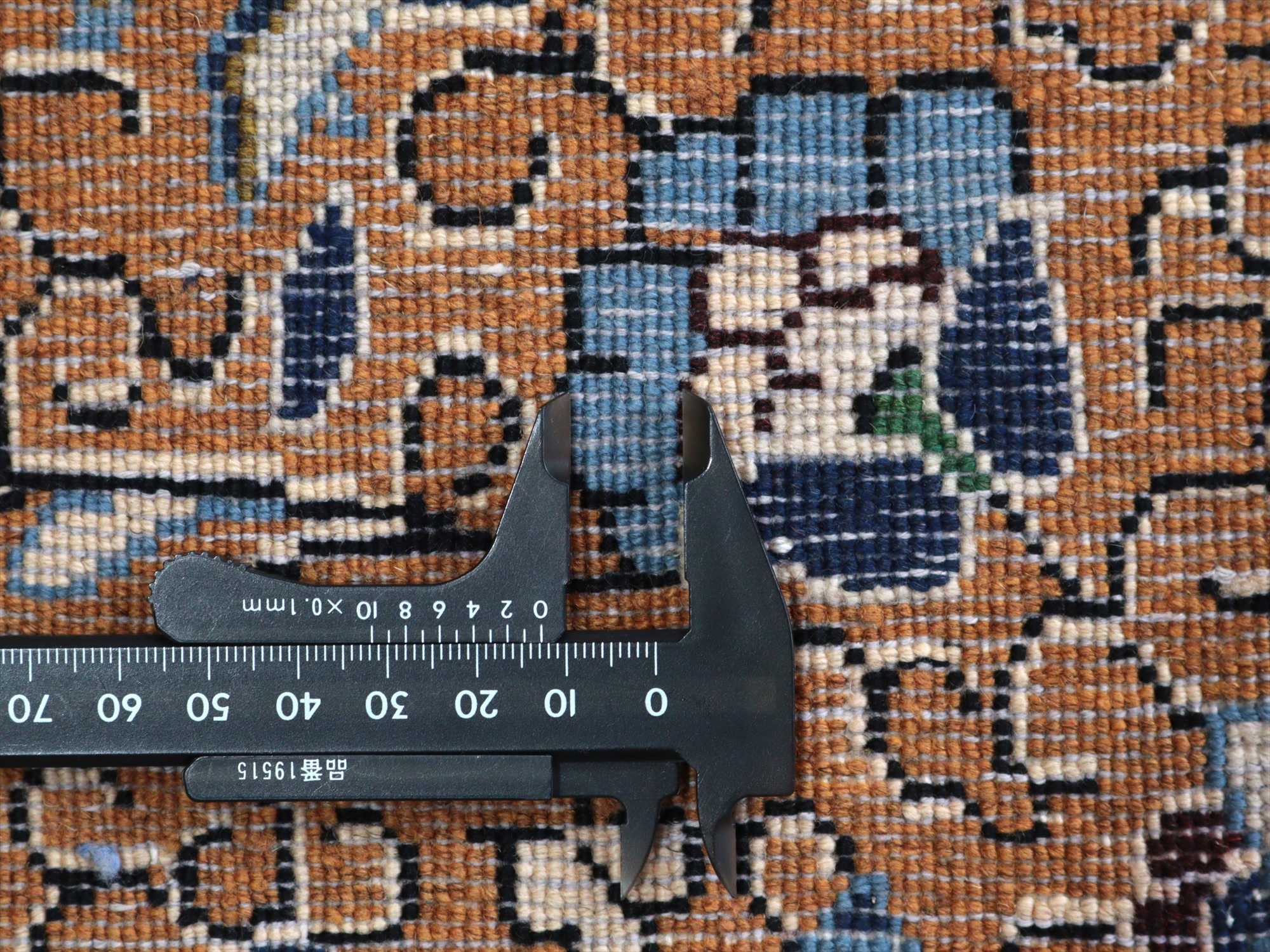 イランのクム近郊の都市シャヘレザーの絨毯。緑がかったブラウンと、ブルー、ネイビーをメインとした色使いで全体が構成された1枚。中央のメダリオンを中心に、一面に花模様が織り込まれた上品なデザイン。