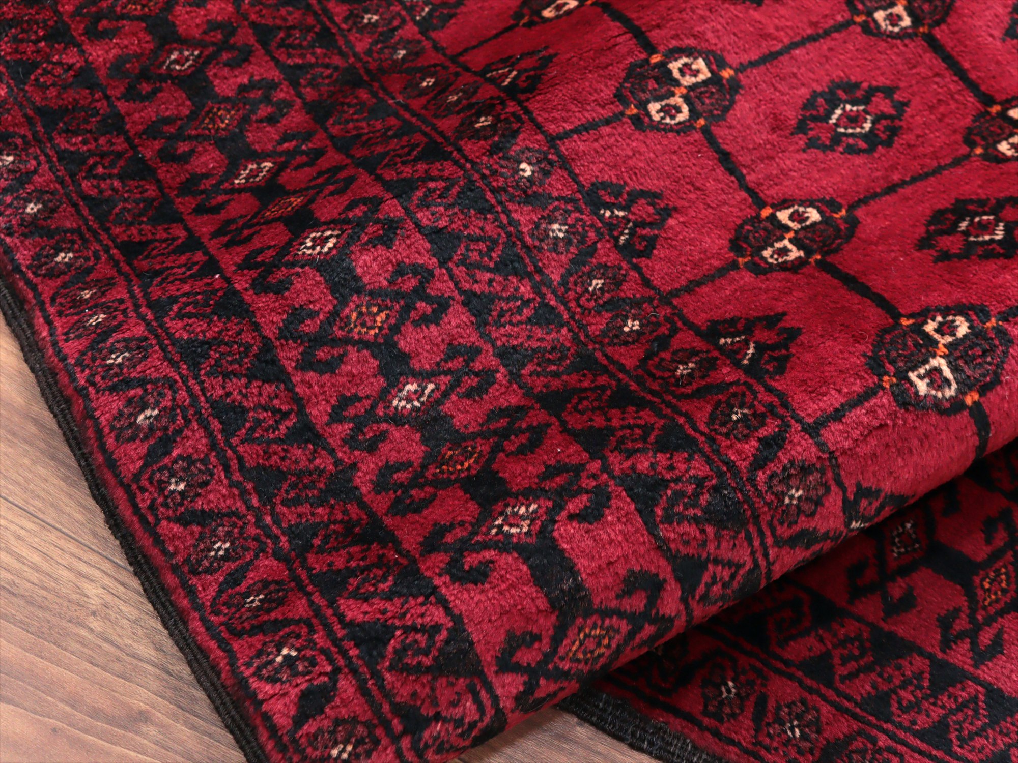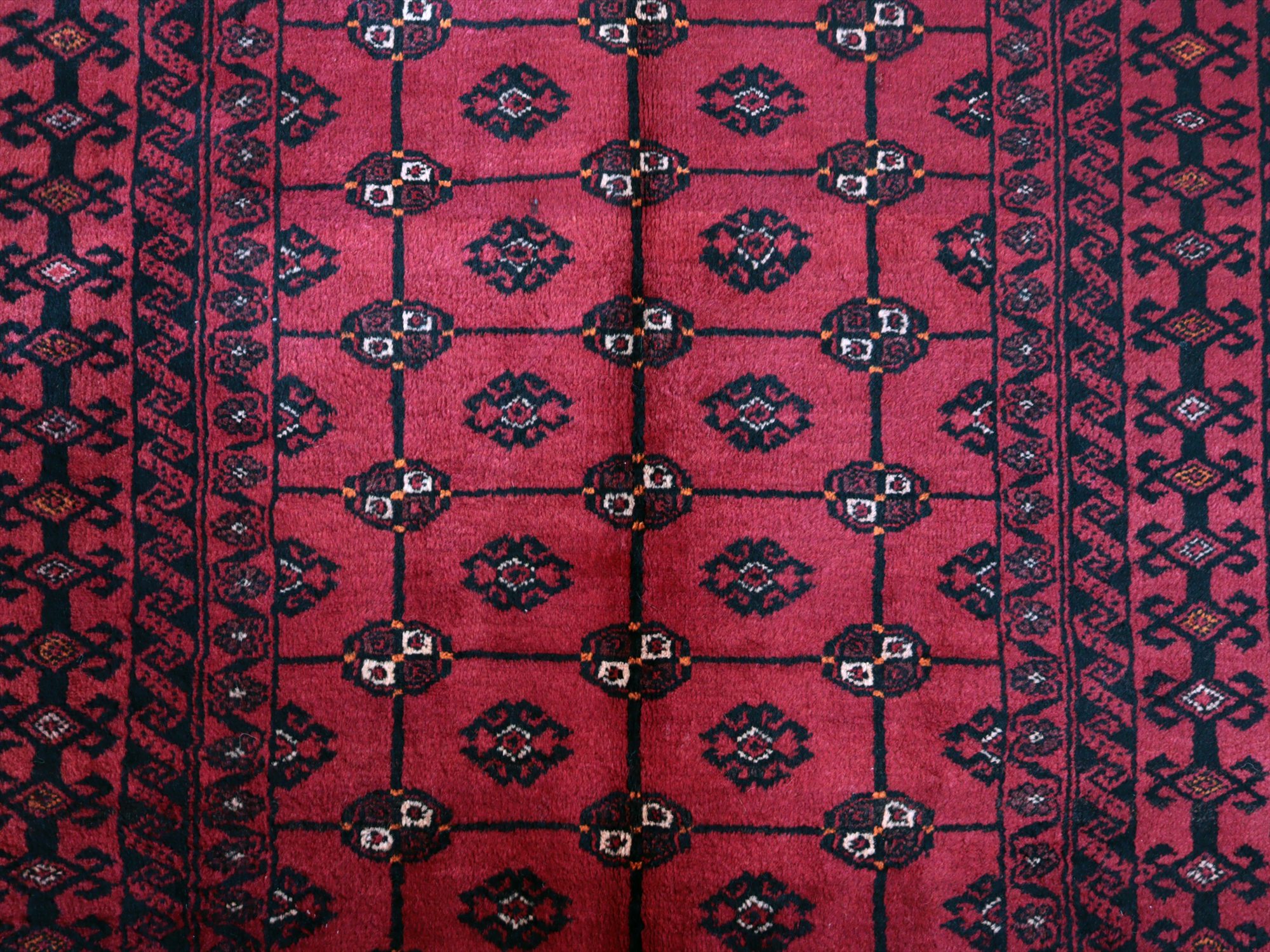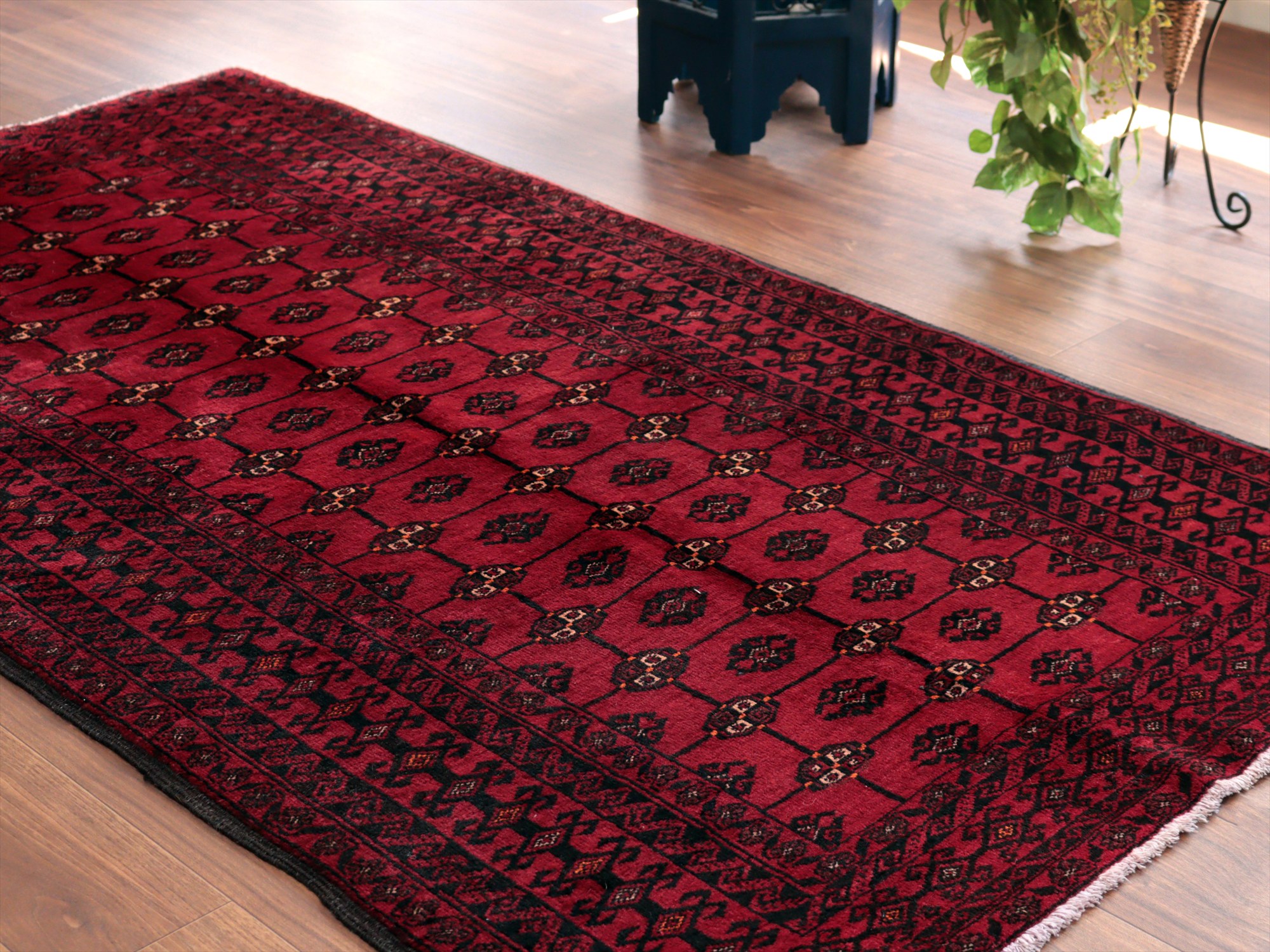 イラン東部からアフガン・パキスタンなどに住むバルーチ族のカーペット。赤地にギュルのモチーフが入ったバルーチの典型的なデザインです。中央のフィールドには、文様が格子状に並ぶように織られていてクラシカルな雰囲気が良く出ています。