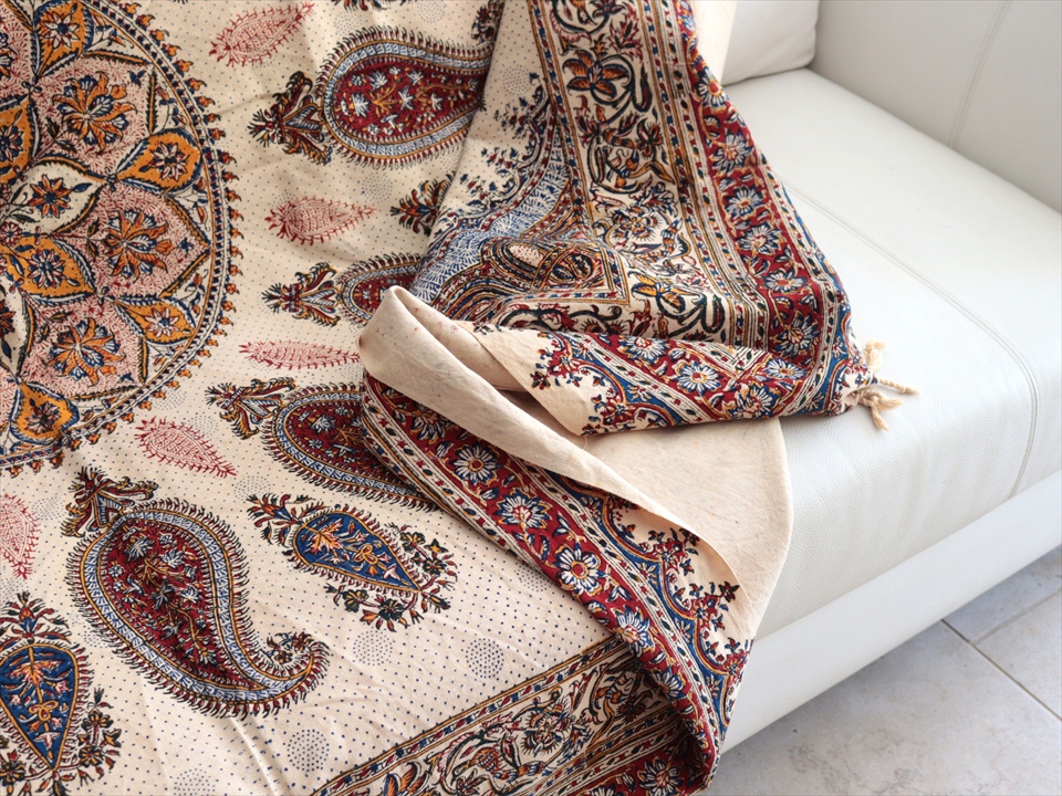 Key:コットン 染色 ブロックプリント 木版 捺染 伝統工芸 ペルシャブルー ペイズリー フリークロス マルチカバー ベッドスプレッド ベッドカバー ソファカバー カーテン タペストリー ファブリック インテリアファブリック クラフト インテリア ペルシャ ペルセポリス イラン 中東 シルクロード アジアン エスニック