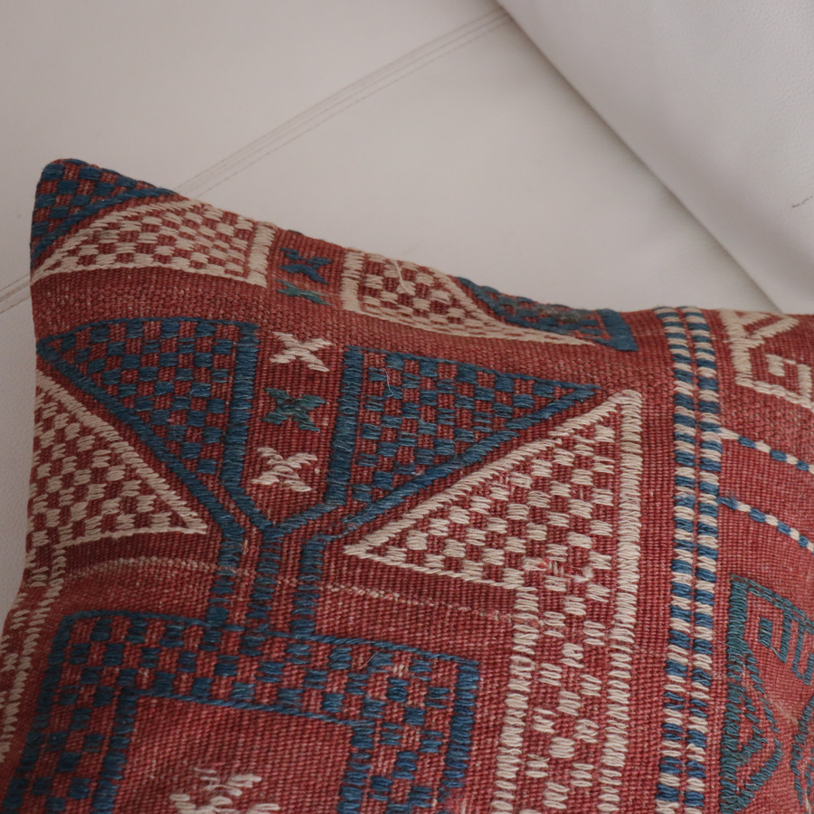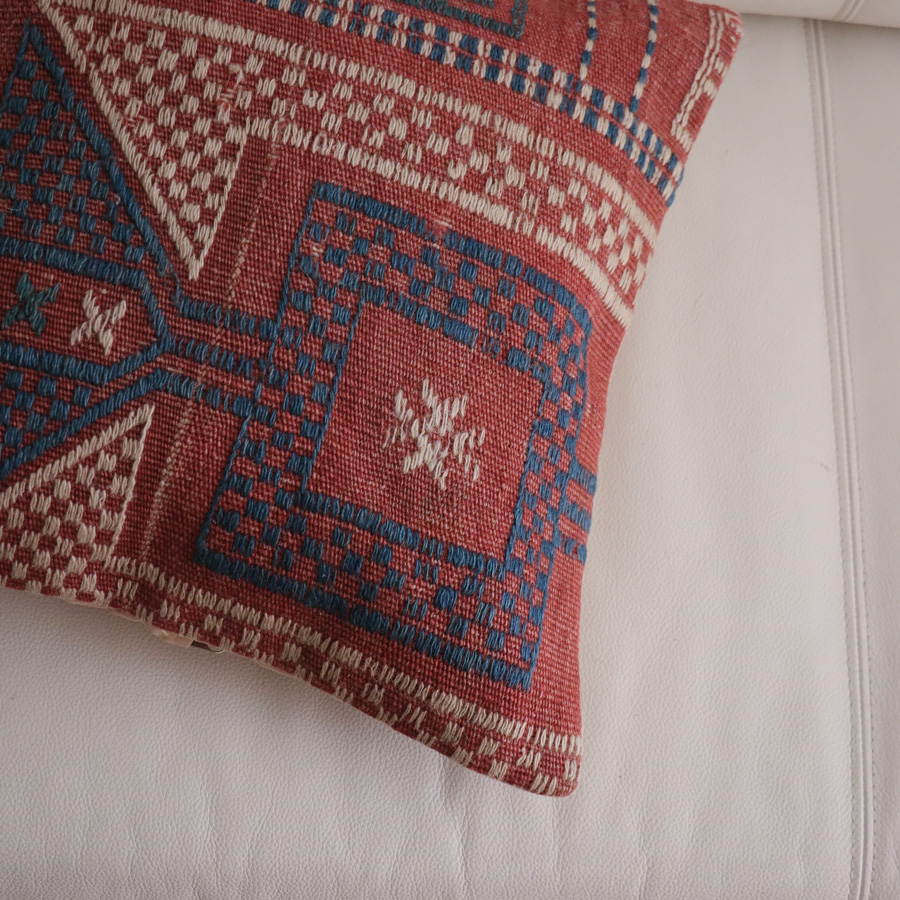 オールドキリムは、トルコの一般家庭で使うために手織りされたウールの平織りの敷物です。クッションカバーに仕立てる前にはクリーニングしてありますが、完全にはとれなかったシミが残っていたり、長い間使われていて擦り切れた部分があったりする場合がございます。インテリアのアクセントとしてだけでなく、手織りの風合いや骨董的な価値を楽しむ商品ですので、ご了承の上ご検討ください。一点ものですので、写真の現品をお届けします。