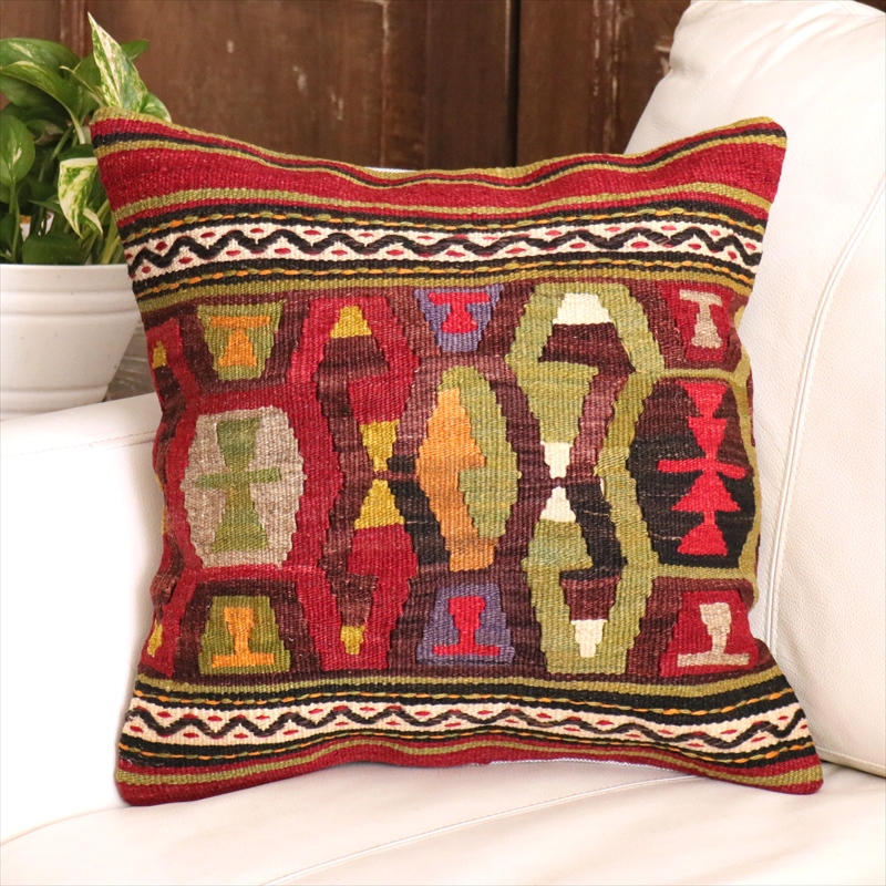 Key:Old Kilim, Kilim Cushion, Turkish Kilim, BOHO, Bohemian Decor, Vintage kilim, クッションカバー40cm, 40×40cm, オールドキリム, トルコ, ヴィンテージキリム, トライバルラグ, インテリア, クッション, クッションカバー, ピロー, ボヘミアンスタイル, BO-HO, ウール100%, 手織り, 一点もの, ガラタバザール