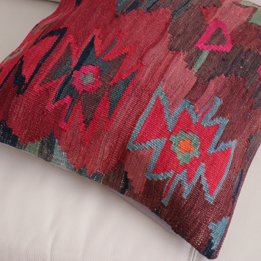 中央部分は青、ボーダー(額縁)は赤色、ボーダーには赤やピンクのベレケットのモチーフを置いた鮮やかな色合いのキリムからのカット。こちらはキリムのコーナー部分にあたります。赤と青色には色の濃淡が見られます。もともとこのような色合いだったのか経年変化による褪色かさだかではありませんけれども、オールドならではのきれいな色合いになっています。