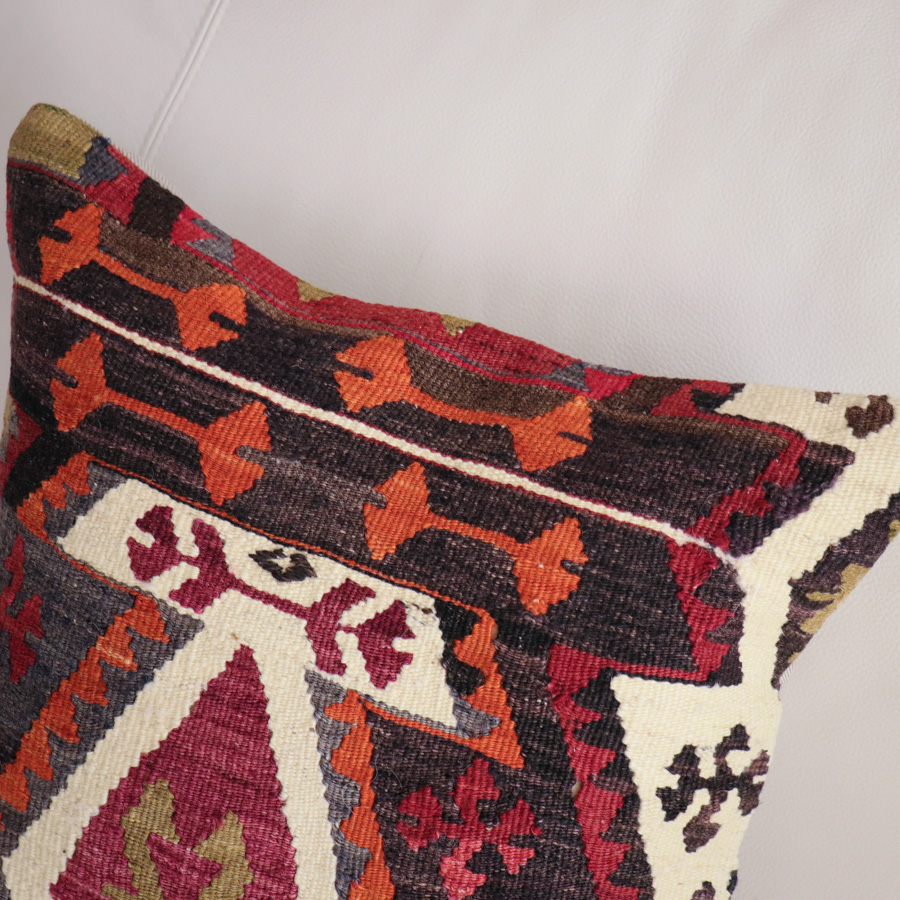オールドキリムは、トルコの一般家庭で使うために手織りされたウールの平織りの敷物です。クッションカバーに仕立てる前にはクリーニングしてありますが、完全にはとれなかったシミが残っていたり、長い間使われていて擦り切れた部分があったりする場合がございます。インテリアのアクセントとしてだけでなく、手織りの風合いや骨董的な価値を楽しむ商品ですので、ご了承の上ご検討ください。一点ものですので、写真の現品をお届けします。