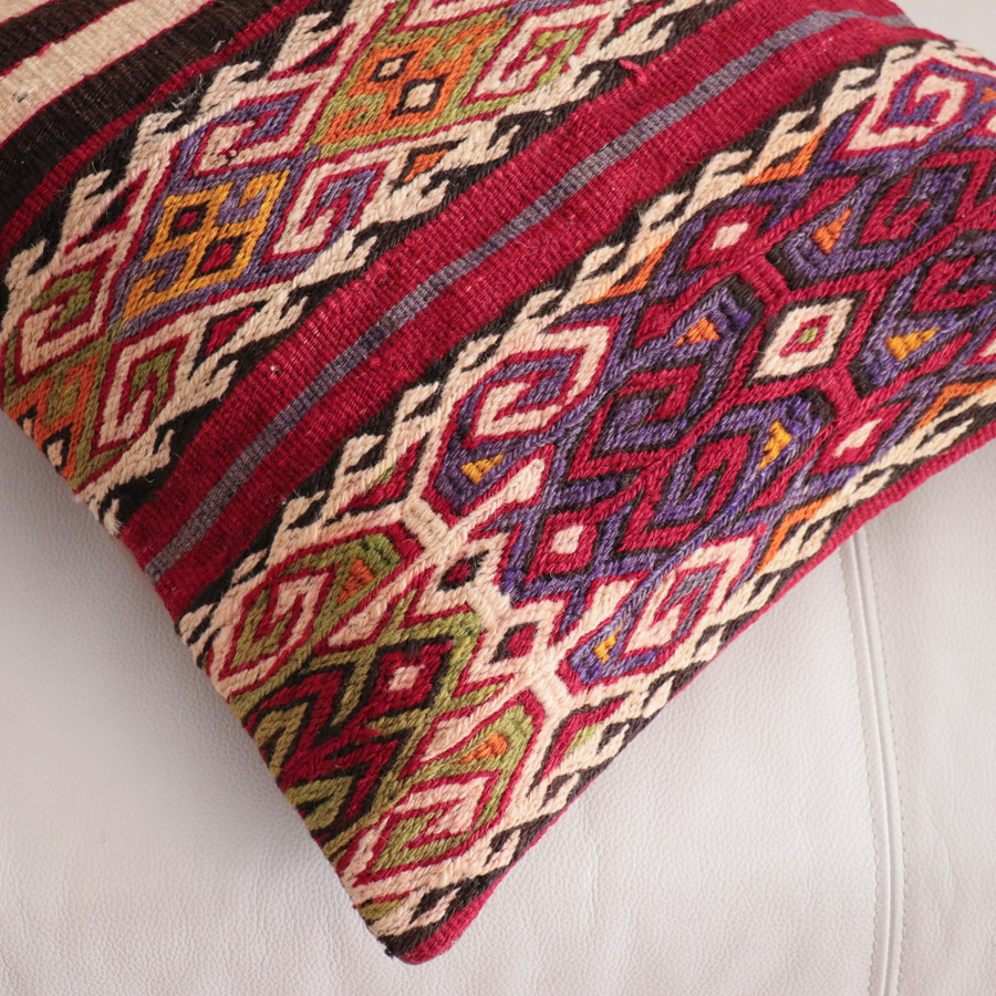 オールドキリムは、トルコの一般家庭で使うために手織りされたウールの平織りの敷物です。クッションカバーに仕立てる前にはクリーニングしてありますが、完全にはとれなかったシミが残っていたり、長い間使われていて擦り切れた部分があったりする場合がございます。インテリアのアクセントとしてだけでなく、手織りの風合いや骨董的な価値を楽しむ商品ですので、ご了承の上ご検討ください。一点ものですので、写真の現品をお届けします。