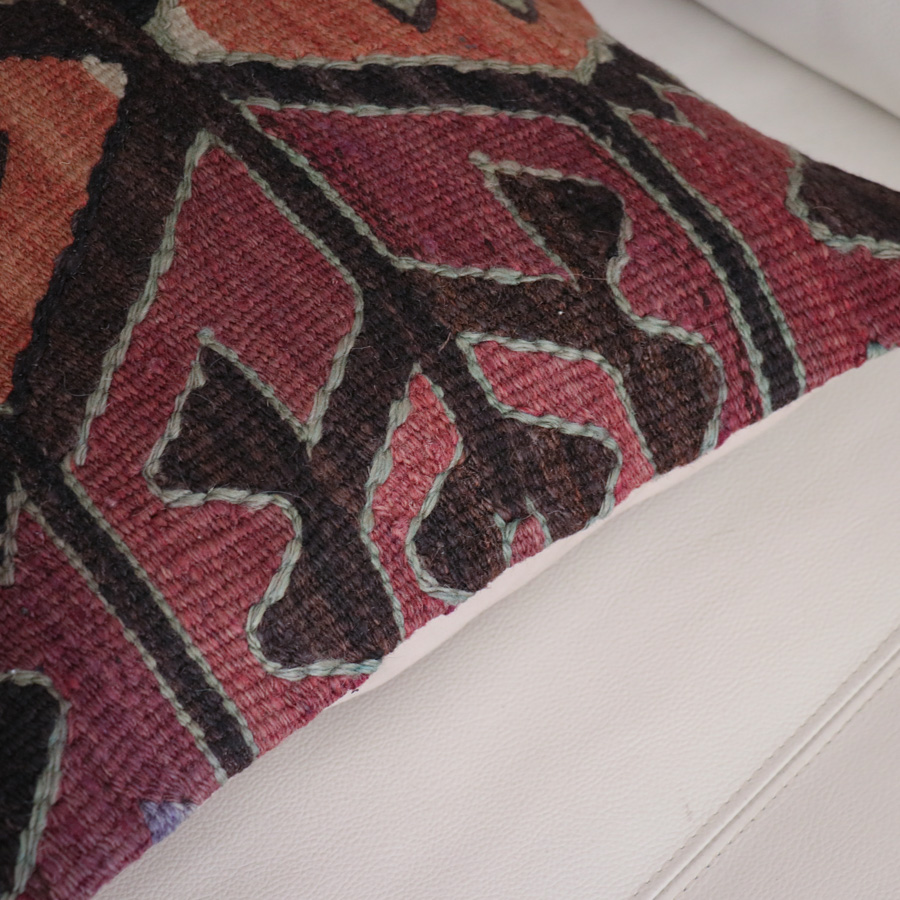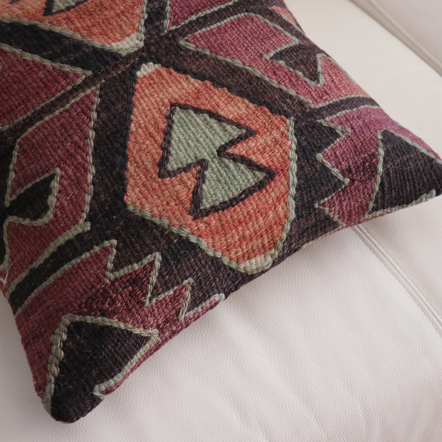 オールドキリムは、トルコの一般家庭で使うために手織りされたウールの平織りの敷物です。クッションカバーに仕立てる前にはクリーニングしてありますが、完全にはとれなかったシミが残っていたり、長い間使われていて擦り切れた部分があったりする場合がございます。インテリアのアクセントとしてだけでなく、手織りの風合いや骨董的な価値を楽しむ商品ですので、ご了承の上ご検討ください。一点ものですので、写真の現品をお届けします。