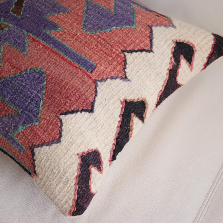 オールドキリムは、トルコの一般家庭で使うために手織りされたウールの平織りの敷物です。クッションカバーに仕立てる前にはクリーニングしてありますが、完全にはとれなかったシミが残っていたり、長い間使われていて擦り切れた部分があったりする場合がございます。インテリアのアクセントとしてだけでなく、手織りの風合いや骨董的な価値を楽しむ商品ですので、ご了承の上ご検討ください。一点ものですので、写真の現品をお届けします。