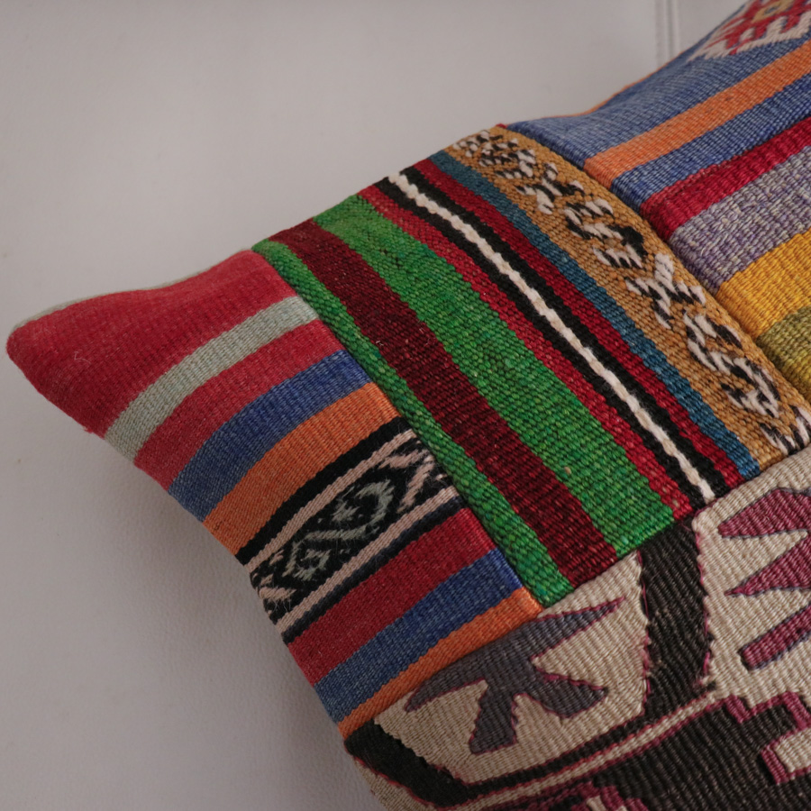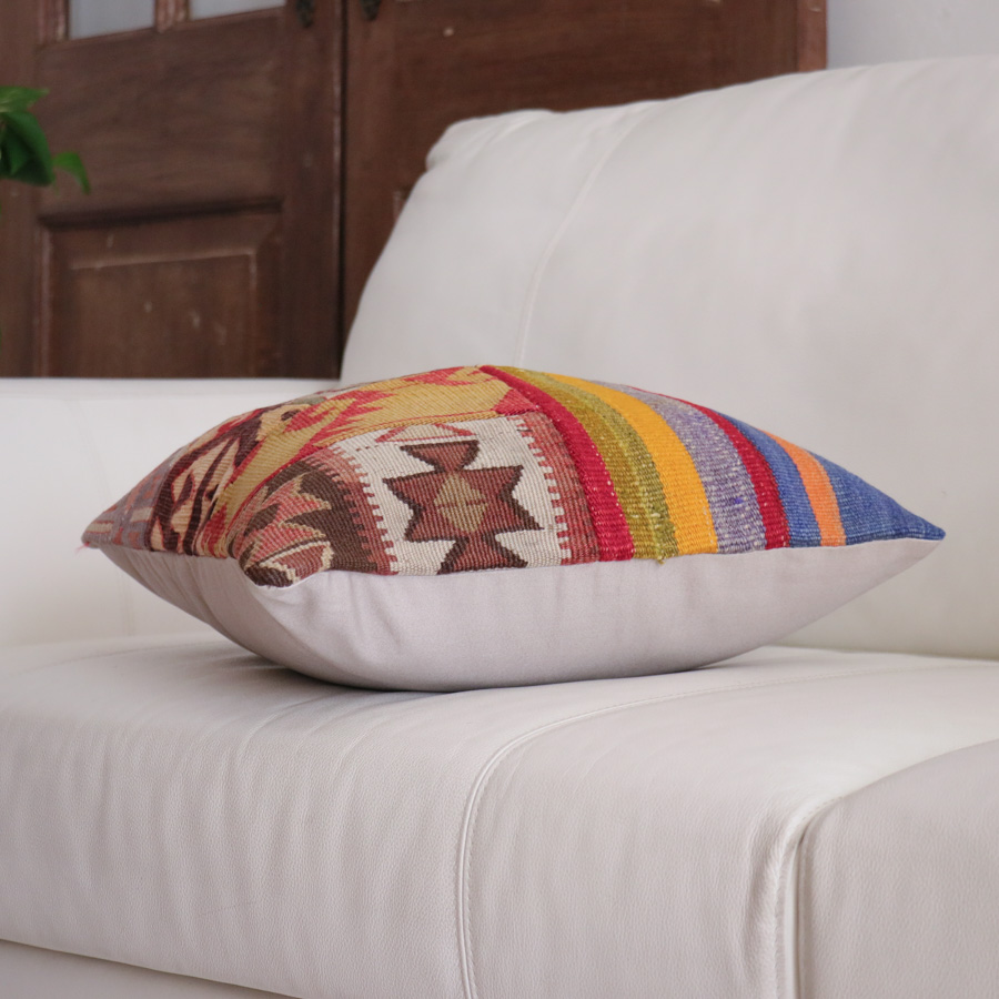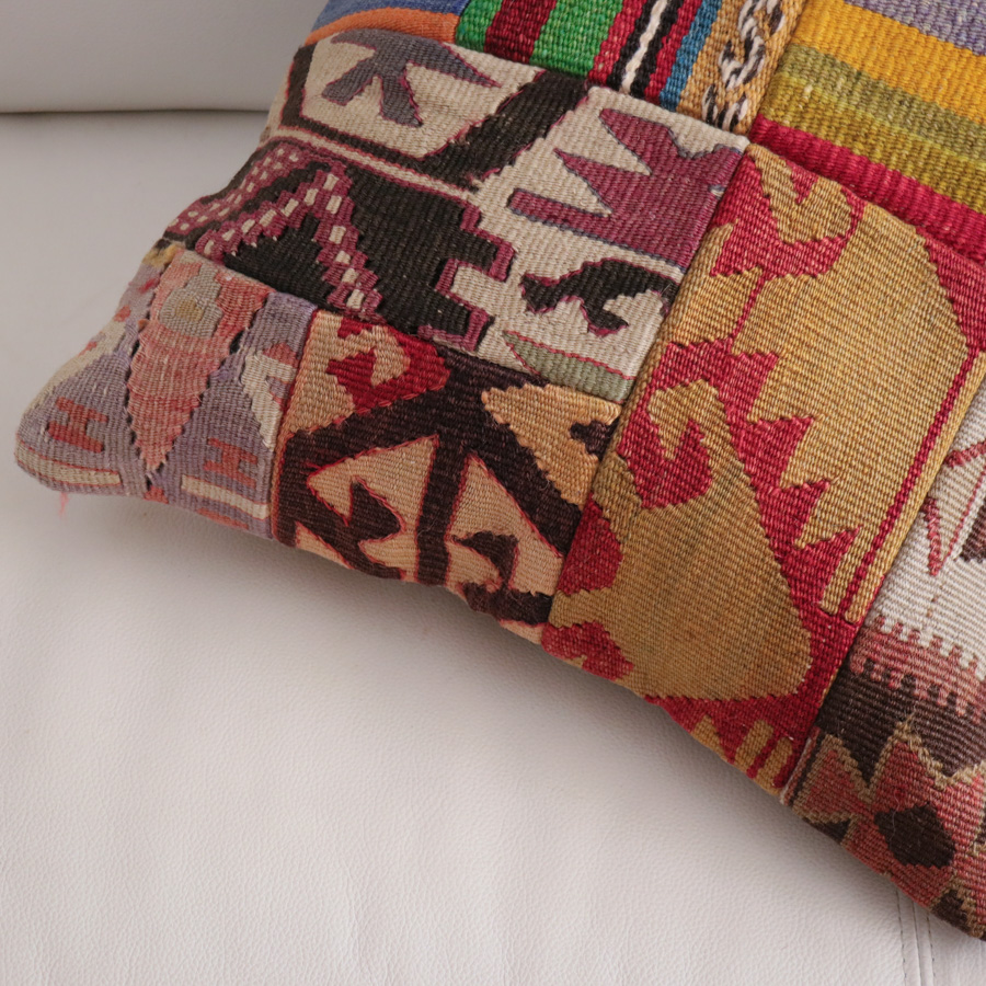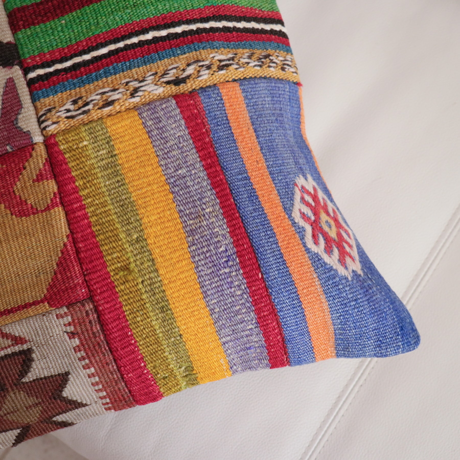 いろいろなオールドキリムを使ったパッチワークでできたユニークなクッションカバー。使われているオールドキリムは、アナトリア(トルコ)全域から集められた40~60年前に織られたもの。厚みや細かさなどそれぞれ違うキリムが、一枚にまとまってオリジナルとは違う新しい魅力になっています。