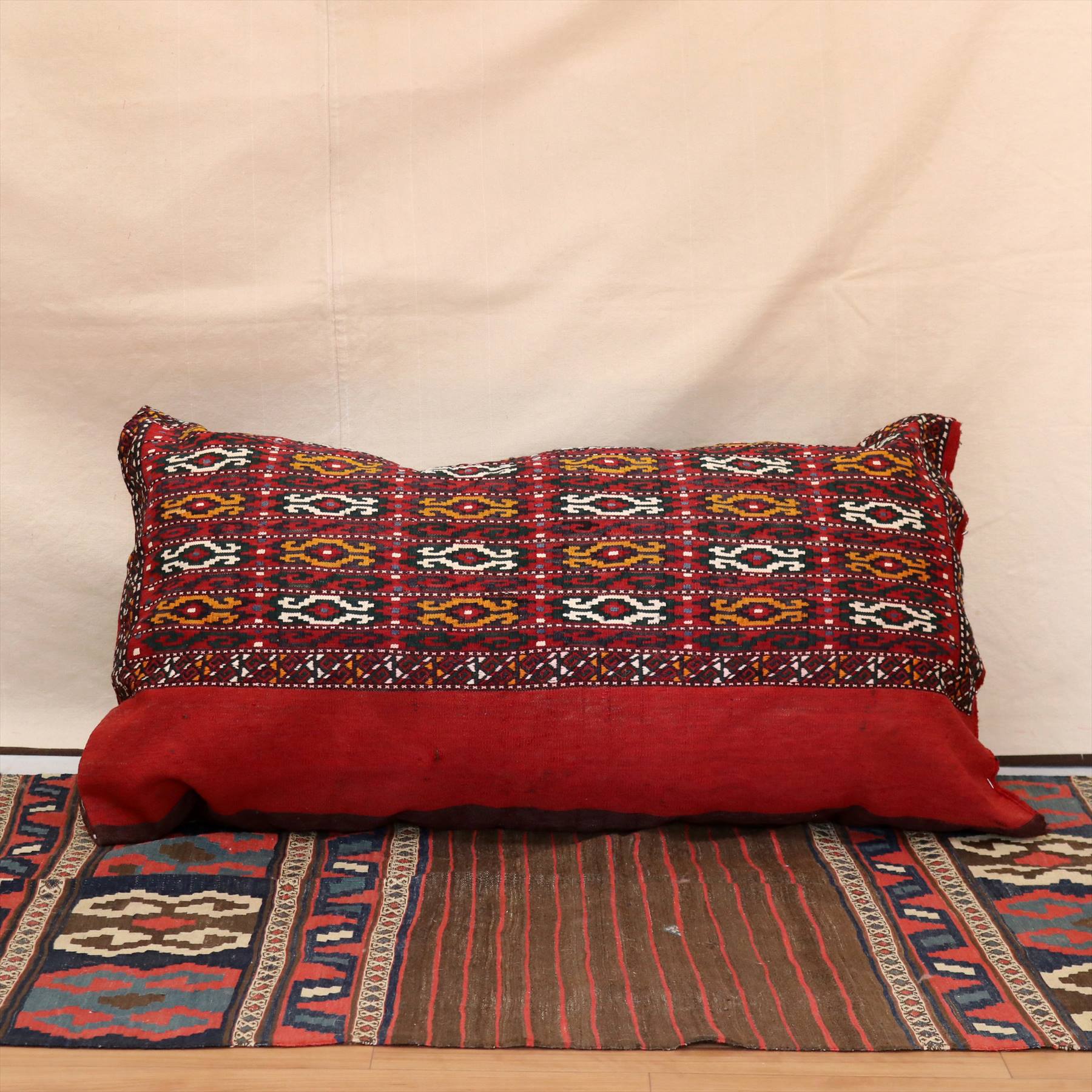 - トルクメン・ヤムート/オールドキリム・クッションカバー・収納袋チュアル104x60cm・表と裏が手織りのキリム赤いジジムのキリム
