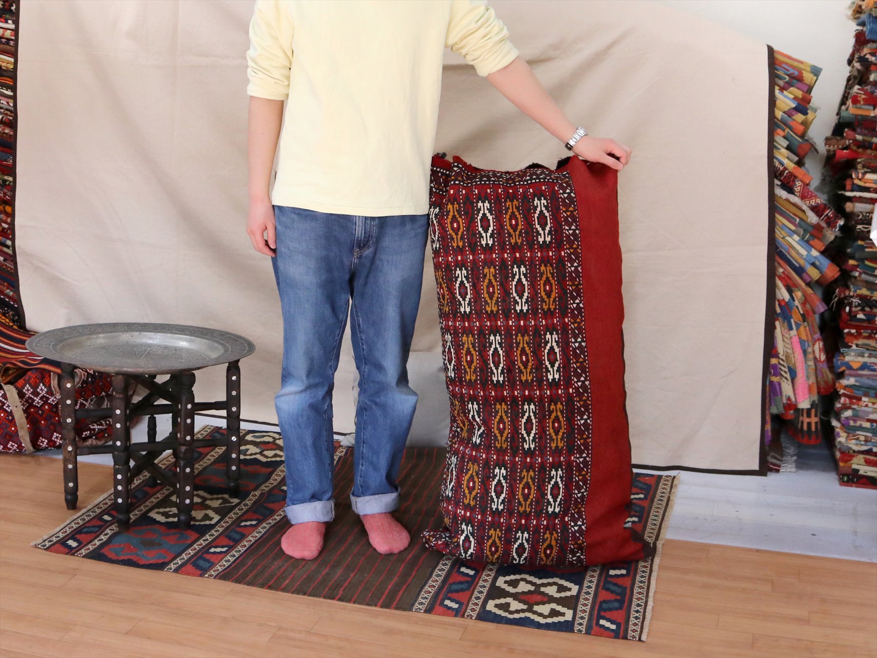 輸入する際は袋を開いた1枚のキリムでしたが、ビックピローとして使えるように再び縫って袋状にしました。端はミシンで縫っています。ファスナーは付いていませんので上部が開いた状態です。