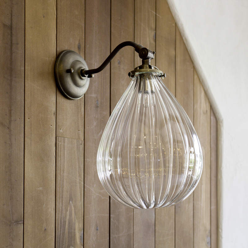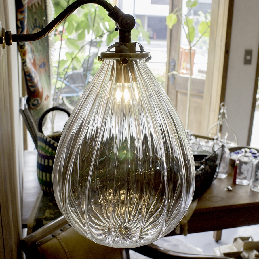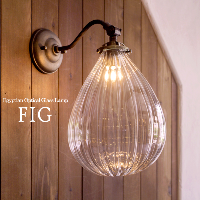 アンティークな雰囲気が漂う真鍮製ブラケットと無花果のようなユニークな形をしたガラスシェードを使った壁掛けランプ。