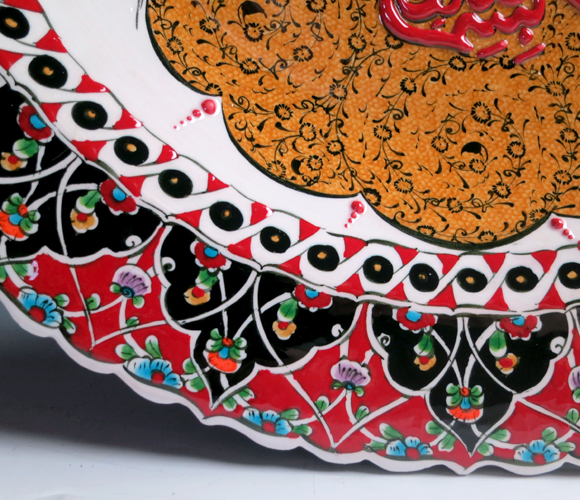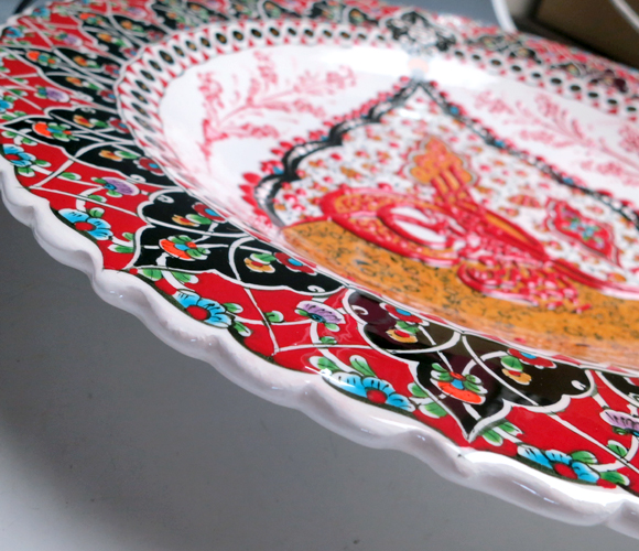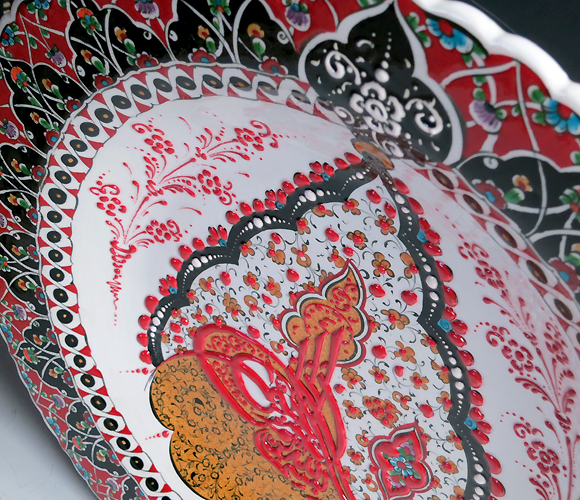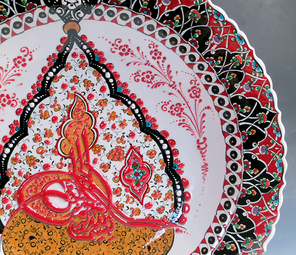 このプレートは、随所に立体的に盛り上がった釉薬を使い、凹凸のある豪華な絵付けが楽しめます。オスマントルコのスルタンのシンボル、トゥーラの紋章を中央に配したデザインです。