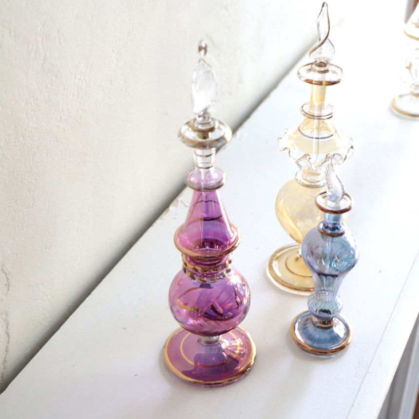 ガラス発祥の地と言われるエジプトは、現在でもシャンデリア用のガラスビーズをはじめ、クオリティの高いインテリアガラスが作られています。古代から作られてきたといわれるガラスボトルは、きらびやかでエキゾチックなムードたっぷり!切子細工で表現された草花モチーフやゴールドの着彩など小さいながらも職人さんの技が光っています。